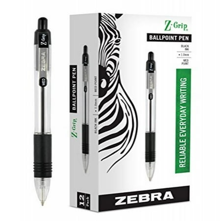 Zebra Z-Grip Retractable Ballpoint Pen, Medium Point 1.0 mm, Black Ink, Clear Barrel, 12-Count